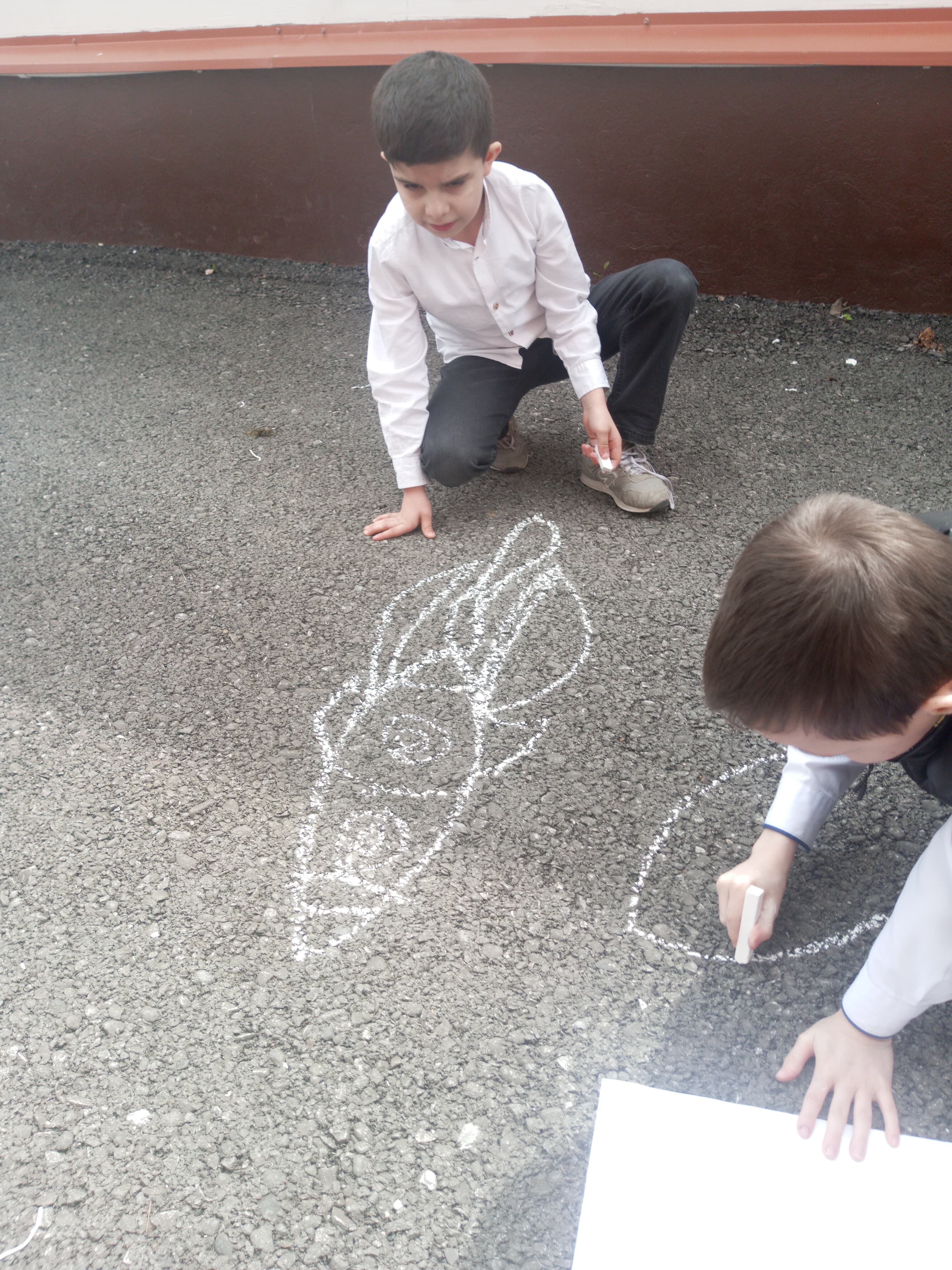 Ребята с большим увлечением играли цветными мелками, и вскоре асфальт на территории гимназии покрылся яркими рисунками. В них дети изображали ракету, небо со звездами, нарисовали космонавта. Детское творчество в технике коллективного рисунка мелом на асфальте позволяет не только проявить творческие способности, но зарядиться хорошим настроением и радостью от собственных «шедевров». С днем космонавтики!